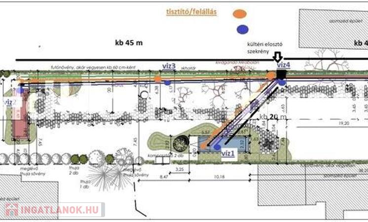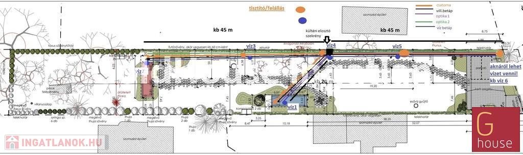 A telek jelenlegi állapota rendezett és gondozott: murvával kialakított, stabil belső parkoló, hosszú gyalogút, távirányítással működő elektromos kapu, geotextillel és kőréteggel megerősített területek, valamint virágágyásokkal, méhlegelővel és természetes növényzettel borított, hangulatos hátsó kert rész jellemzi. A közművek kényelmesen hozzáférhetők, a föld alatti vízakna és a mérők a telek utcafronti oldalán találhatók.