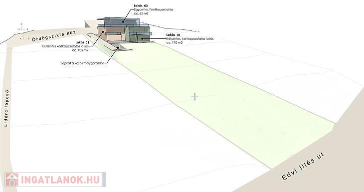 A telekhez készült látványterveken a felső, 3 lakásos ház tartozik a szóban forgó telekhez.