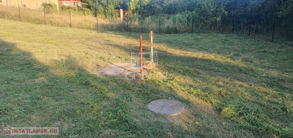 A telek kerítéssel körbekerített, víz, csatorna bekötve, gáz, villany telek előtt.