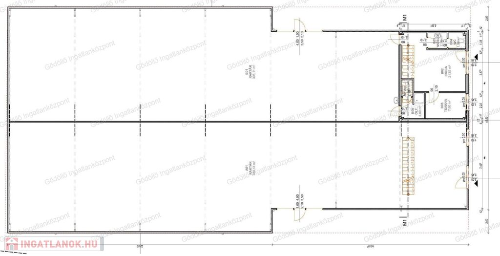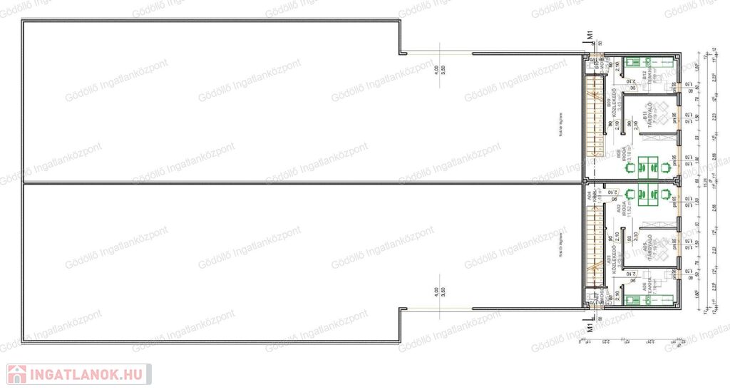 Raktár (300nm), a földszinten (36nm) és a galérián (36nm) is irodák, szociális helységek (wc, fürdő, öltöző, teakonyha) + telekrész 456m2