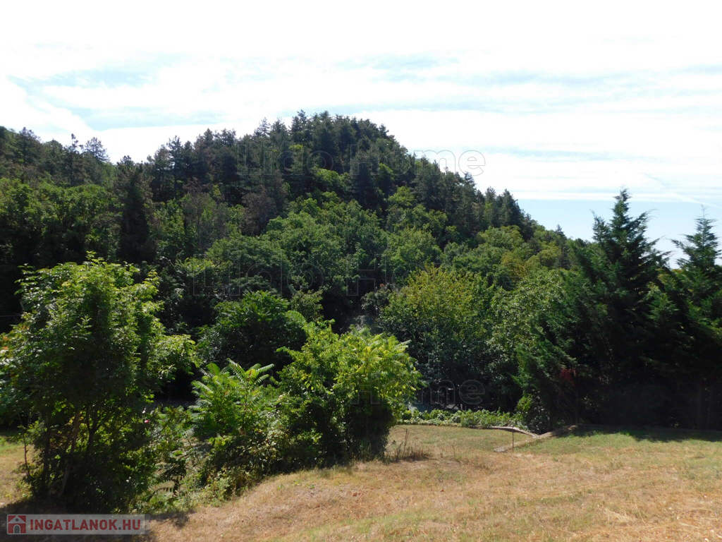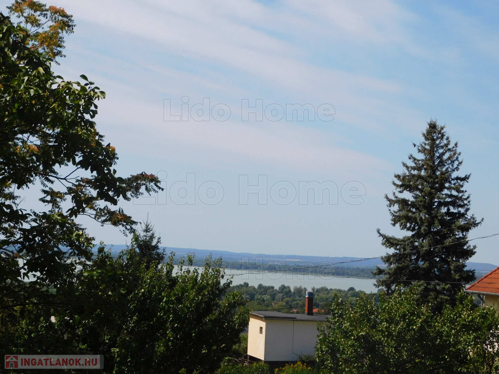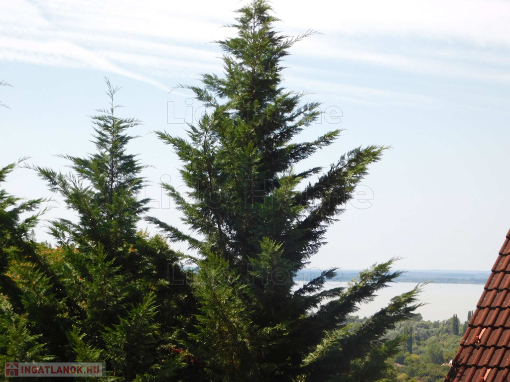 Kilátás a telekről: részben balatoni panorámás és erdőre néző.