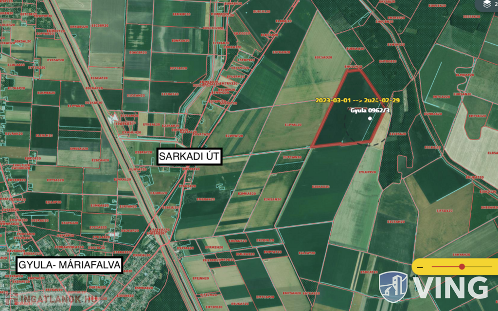 Gyula külterületén, a Sarkad út mellett, Oláh-Rétben eladó egy 2,02 ha alapterületű szántó besorolású termőföld. Az ingatlan teljes alapterülete 4,0468 ha, értéke 76 AK (melyből 0,4428 ha 10.41 AK és 3,6040 ha 65,59 AK), melynek az 1/2 tulajdoni hányada vásárolható meg. A termőföld folyamatosan művelve van, jelenleg is hosszútávú haszonbérleti szerződéssel rendelkezik a tulajdonos. A föld a Sarkadi útról bekötőúton keresztül megközelíthető. Befektetést keres, vagy gazdálkodni szeretne? Itt a tökéletes választás! Várom hívását!