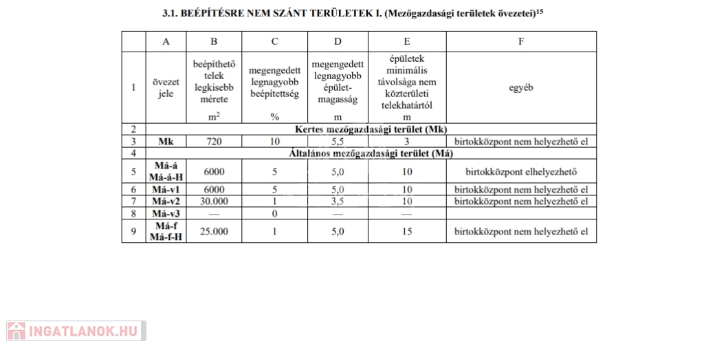Má-á, azaz általános mezőgazdasági övezetbe tartozik, csak 6000 m2-nél nagyobb terület beépíthető 5%-ban.
