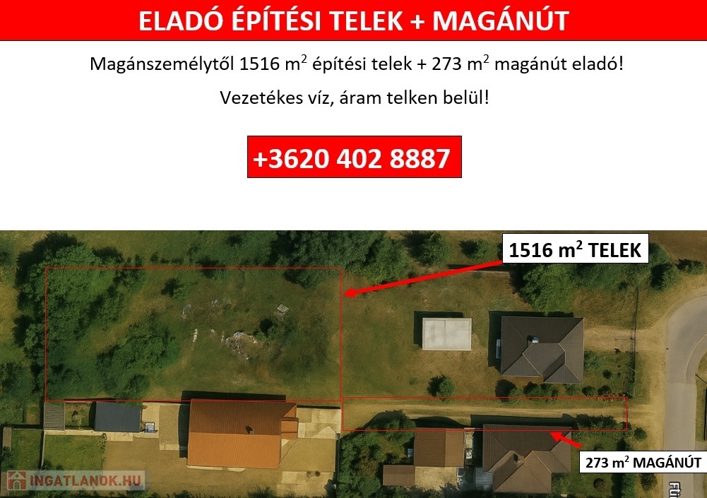 Méret: 1516 m2 telek + 273 m2 magánút. (Lásd. képek)