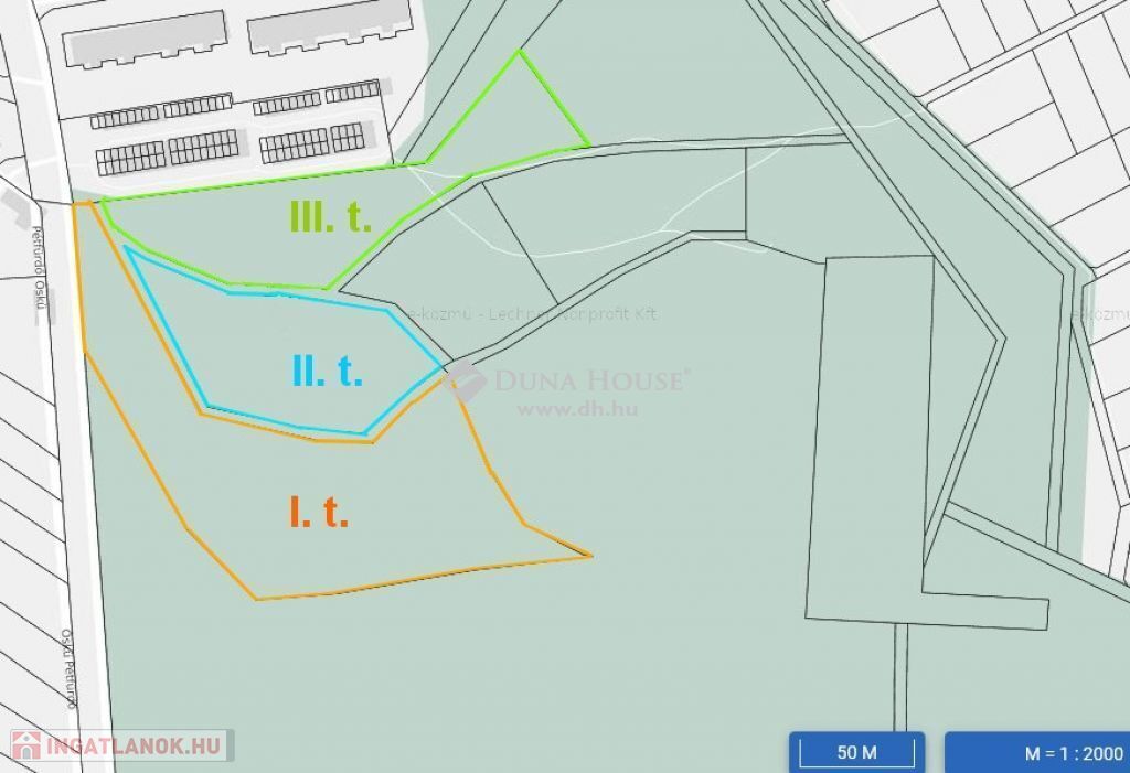 Pétfürdő déli részén eladó három egymás mellett fekvő ipari, gazdasági, kereskedelmi, vagy egyéb hasznosításra alkalmas telek.Mindhárom telek régebben külterületen helyezkedett el, de ez év szeptemberétől a Településrendezési terv felülvizsgálata által belterületté lett nyilvánítva Gksz besorolással. A három közül a déli I. terület 12668nm és kivett lakóház udvar minősítésű, a középső II. terület 5558nm és kivett gazdasági épület, udvar minősítésű. Egyik területen sem található épület csak az alap maradványai. A jelenlegi állapotban rét, bokrokkal benőve. A III. terület 6764nm legelő minősítésű.A területek északi, település közeli részén a területet nyugatról határoló út mentén villany, víz és gáz csatlakozási lehetőség rendelkezésre áll.