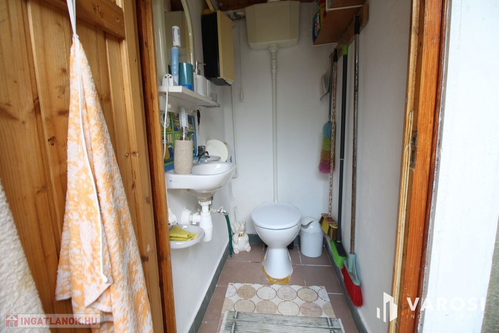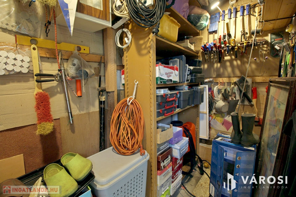 A telken található épület, beton alapon álló zártszelvény vázas, szigetelt faház. Vezetékes víz, villany a házban, gázcsatlakozási lehetőség az utcában, valamint kábeltévé és internet is elérhető. A ház konyhával és zuhanyzóval rendelkezik, külön helyiségben vízöblítéses wc van, de jelenleg fűtés hiányában állandó lakás céljára nem alkalmas. A fő épületet, katonás rendben, felcímkézett dobozokkal bepakolt tárolók és szerszámos helyiség egészíti ki, valamint egy betonozott falú pince és szintén betonozott falú komposztáló.