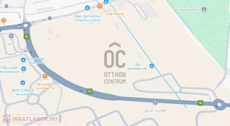 Az ingatlan a város déli kereskedelmi negyedében, forgalmas helyen, közvetlenül az 56-os főút mellett helyezkedik el. Ez közvetlen kapcsolatot teremt a 6. számú főúttal, valamint az M9 autópályán át az M6 autópályával. A telek közelében Park Center üzletközpont, Lidl áruház, OBI barkácsáruház, Penny Market és TESCO áruházak, valamint Mc Donalds Étterem és MOL kút van. A beépítéshez szükségek közművel az ingatlan előtti közterületen rendelkezésre állnak. A terület kivett beruházási területként nyilvántartott.