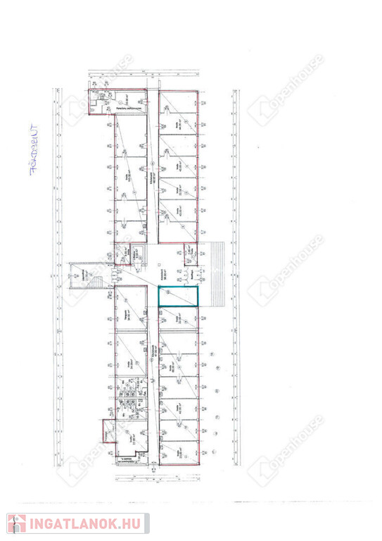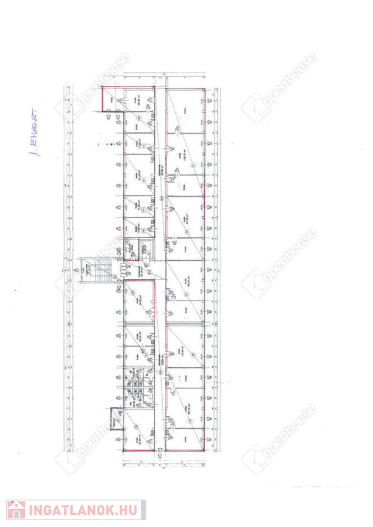 Földszint bal oldal: 14 db fél szoba amik egy ágyasak, 4 db nagy szoba melyek 2 ágyasak. Kazánház, konyha, 2 mosdó, melyekben 4 tusoló, 5 wc, és 3 piszoár található.