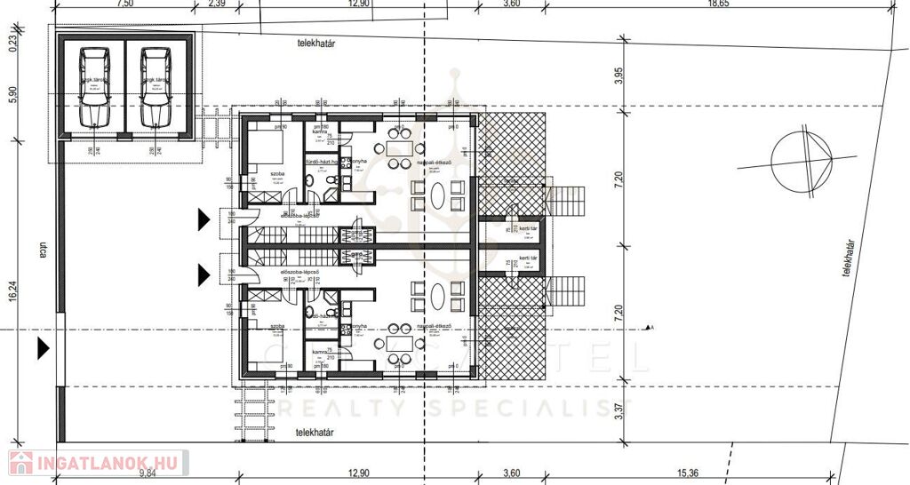 Zártsorú beépítés esetén a 2 telken 4 egyforma sorház-egység létesíthető