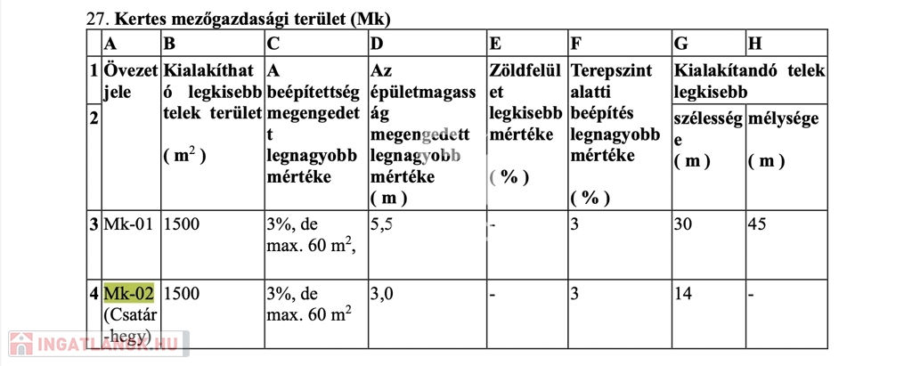 Legnagyobb beépítettsége: 3% - 2x57 m2 (földszint+tetőtér)