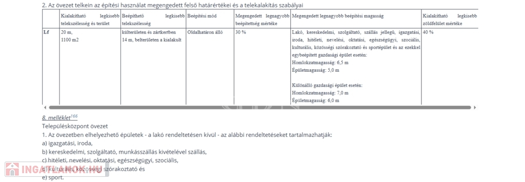 A részben sík terület Lf övezeti besorolású, melynek jogszabály szerinti legnagyobb beépíthetősége 30 %.