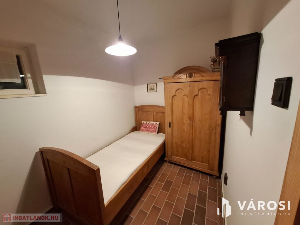 Az alsó részen fedett kocsibeálló, kerti sütő és pihenőterasz található; az épületben amerikai konyhás nappali, fürdőszoba és két félszoba van, cserépkályhával fűtve.