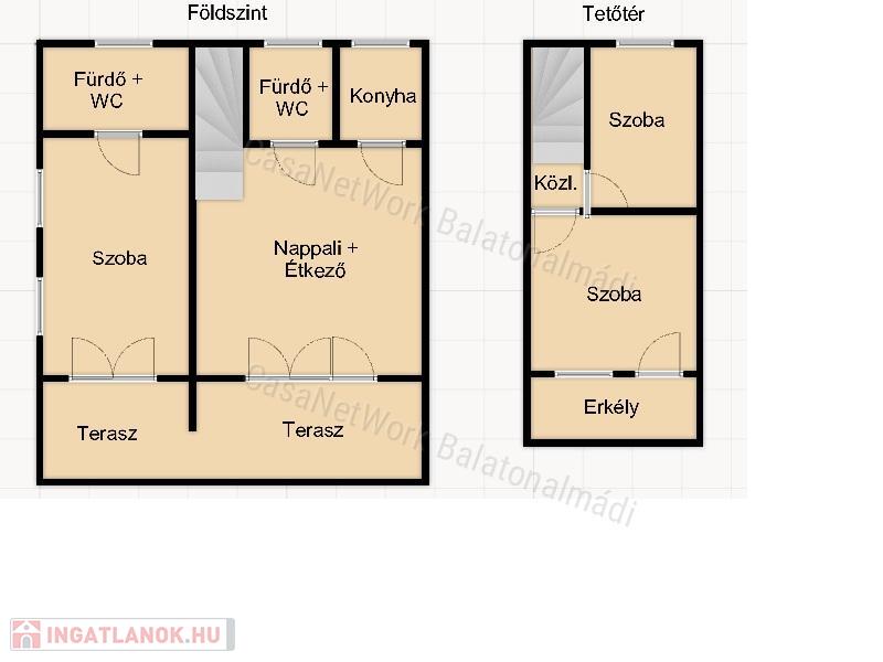 - külön bejáratú nagyobb része tetőtér beépítéses, 2+1 szobából, konyhából, fürdőszobából áll, másik része teljesen elszeparálva 1 szoba+fürdőszoba.