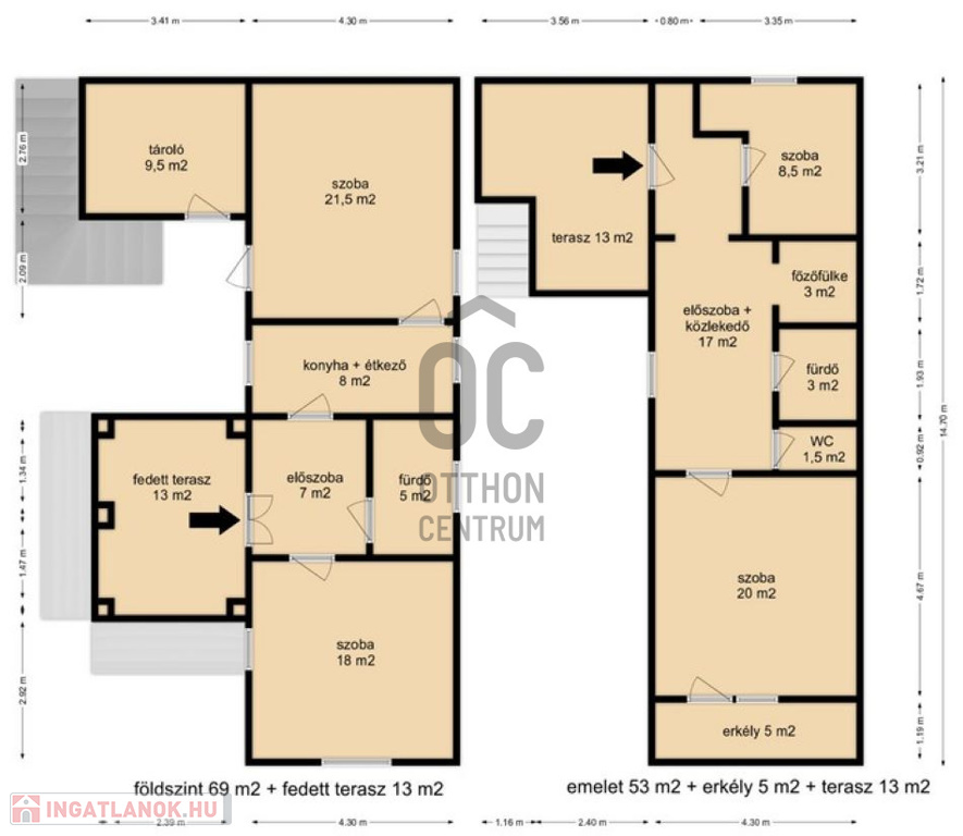 - A külső lépcsőn elérhető felső szint 53 m2-es, ahol szintén kettő szoba, előszoba, WC, fürdő, főzőfülke, erkély és terasz került kialakításra.