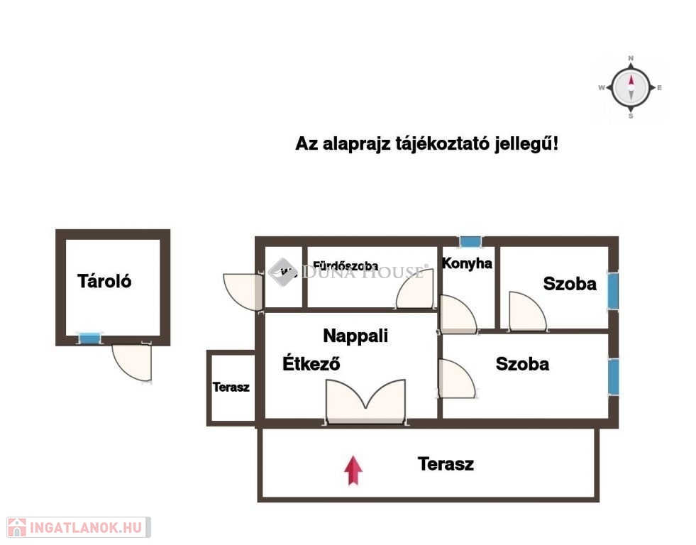 Az ingatlan felosztása: szoba, nappali - konyha- étkező, fürdőszoba, külön wc, terasz elosztású.