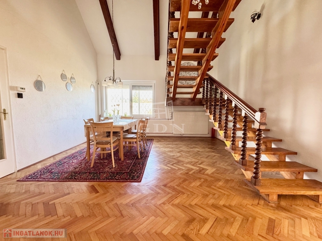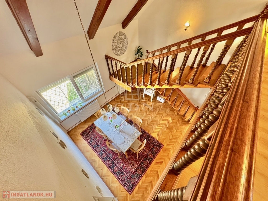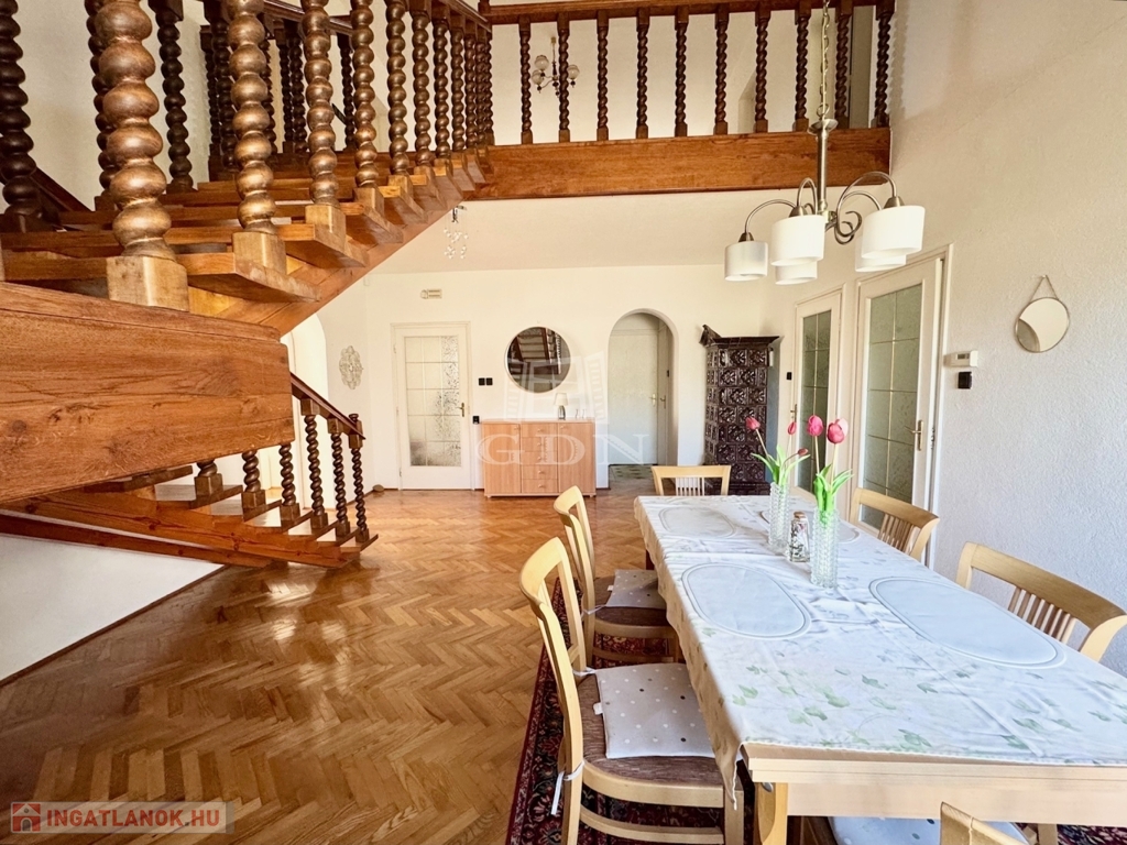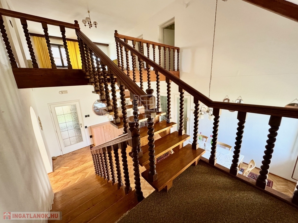 A Balaton északi partjának egyik legszebb városában, Balatonfüreden, kiváló közlekedés és ellátottság mellett, kertvárosi környezetben, 10 perc sétára a vitorlás kikötőtől, és a Tagore sétánytól, 586 m2-es összközműves telken, 1990-ben épült, 190 m2-es lakóterületű, 2 szintes, dupla komfortos, dupla nappalis + 3 hálószobás, a földszinten található nappaliból közvetlen 40 m2 -es teraszkapcsolattal rendelkező, kiváló elosztású, külön nyíló szobás, napos-világos, K-NY-i tájolású, alacsony fenntartású, kombinált gázcirkó és cserépkályha fűtésű, jó állapotú, 2018-ban új thermo ablakokra cserélt, klimatizált, riasztórendszerrel felszerelt családi ház, beépített, gépesített konyhával, nagyméretű tárolóval, garázzsal, úszómedencével, rendezett kerttel, rugalmas költözéssel eladó.