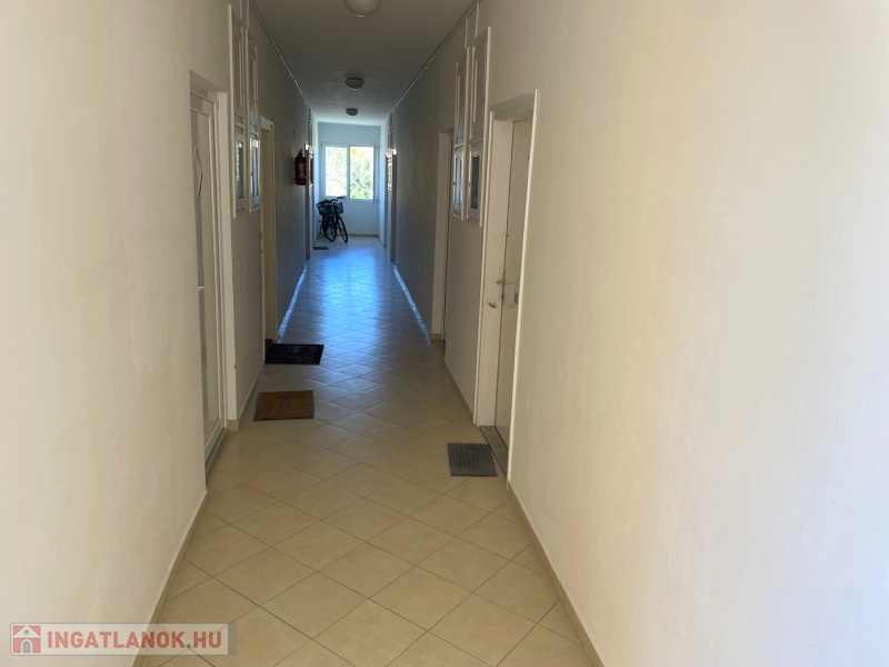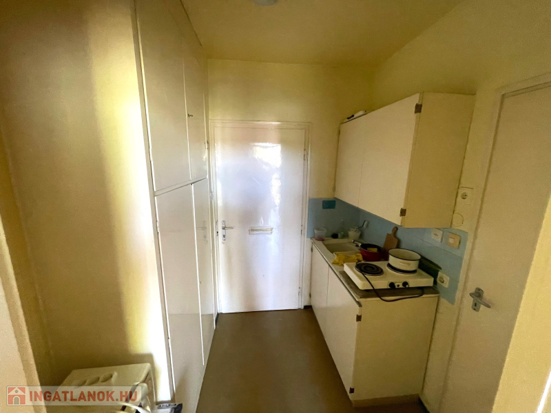 Az egyszobás, mini garzon méretű lakrész: teakonyha, kádas fürdőszoba + WC, lakószoba,8 m2-es erkély elosztású.