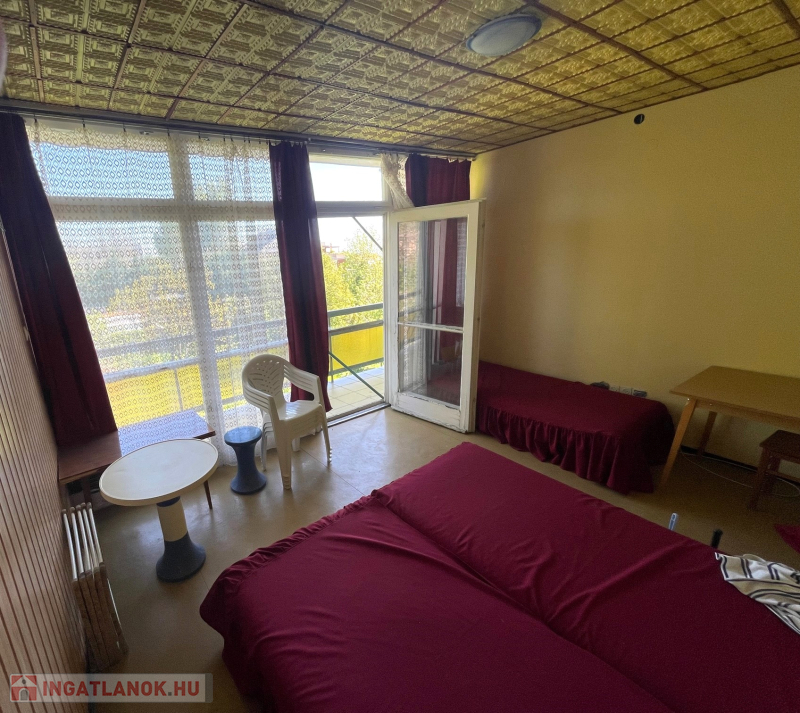 Füred Arács városrészében, a Vadvirág Társasüdülőben vált eladóvá ez a 27 m2-es, erkélyes, egy szobás apartman, melynek erkélyéről balatoni panoráma látható.