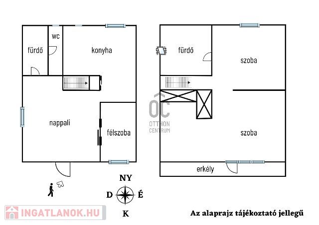 Emelet: két szoba, fürdő-WC, erkély.