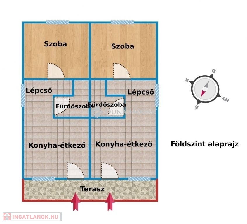 A két lakrész egymásnak szinte tükörképe, lakrészenként 55 nm-esek. Mindkét lakrész 3 szobát, 2 fürdőszobát és konyhát tartalmaz.