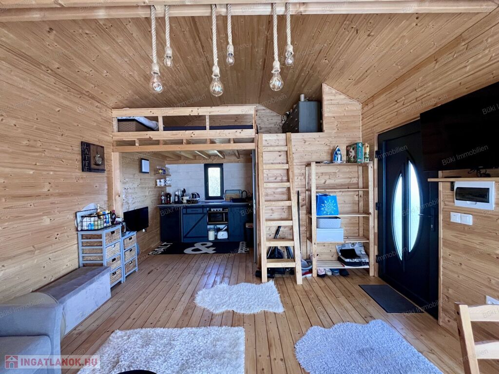Bár a ház alapterülete 25 m², a belső tér a 8 m²-es beépített galériának köszönhetően tágas és világos maradt, így kényelmes életteret nyújt. A faház természetes melegségét modern technológiával ötvözték: a téli komfortról és az alacsony fenntartási költségről energiatakarékos infrapanelek gondoskodnak.