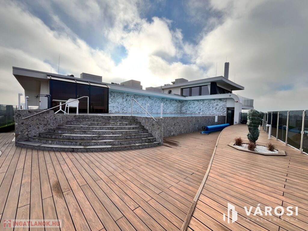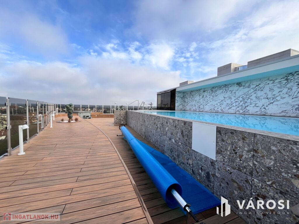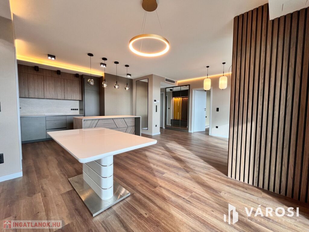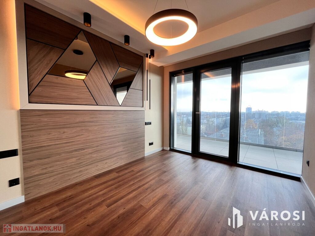 Debrecen egyik legfrekventáltabb sugárútján, az ikonikus Egyetem Tower társasház legfelső lakószintjén (8. emelet) eladó egy új építésű, 91 m²-es, prémium kategóriás luxuslakás.