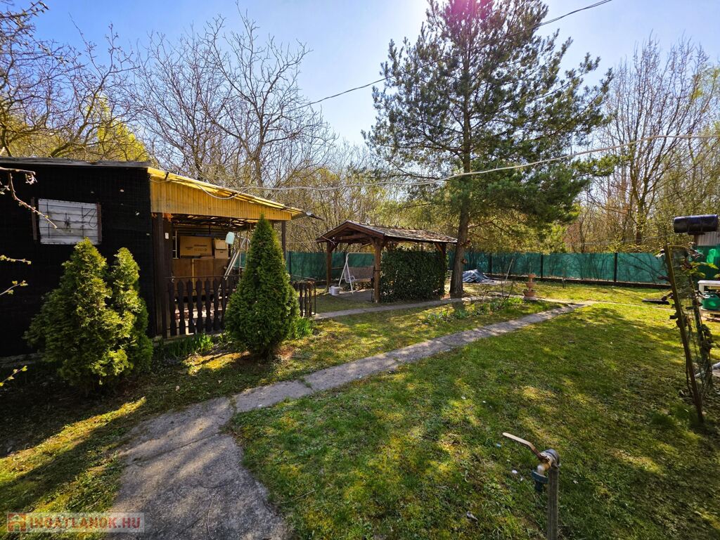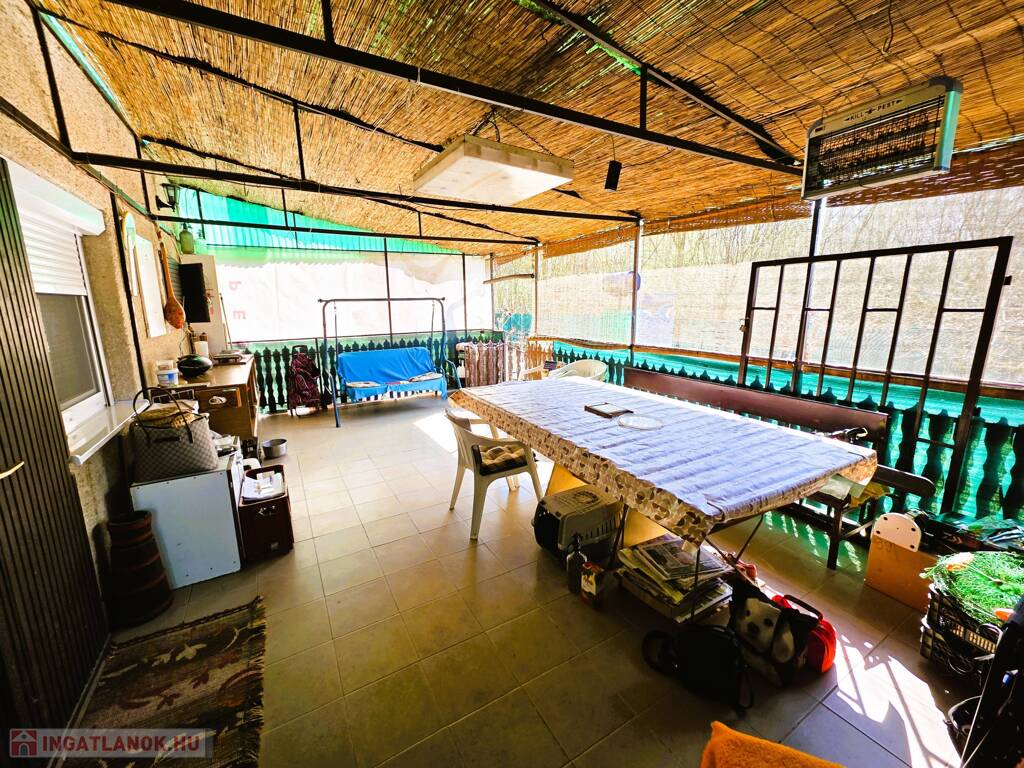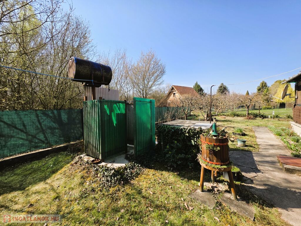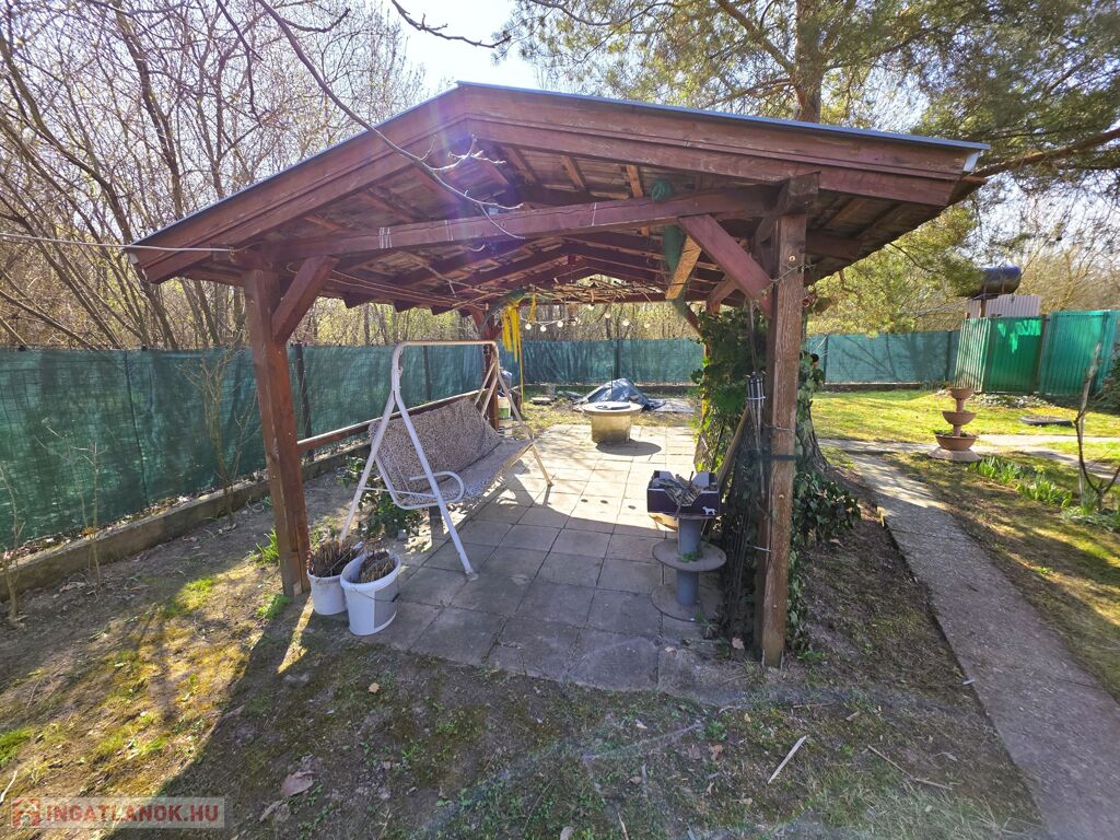 Kiegészítők és kert: Faépítésű 12+4 m²-es tároló 8 m²-es fedett terasszal, kerti pavilonnal és sütővel. A kertben gyümölcsfák (2 alma, 5 körte, 1 meggy), szőlőlugas, szeder, diófa, mogyoróbokrok, rózsák és változatos virágok. Kerítés szövött dróttal, utcafront vasrácsos kapuval, biztonsági riasztórendszerrel. Vízellátás és öntözés fúrt kúttal, parkolás zárt udvarban.