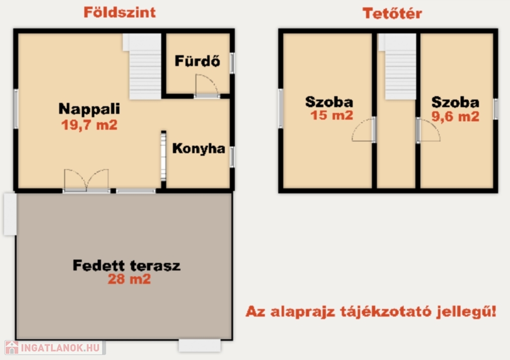 Praktikus elrendezés: földszinten nappali, konyha-étkező és tusolós fürdőszoba, tetőtérben két szoba. A lakóterülethez 28 m²-es fedett terasz tartozik, tökéletes családi és baráti összejövetelekre.