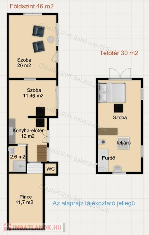 - két szinten összesen 72 m2 nettó alapterületű ház + pince
