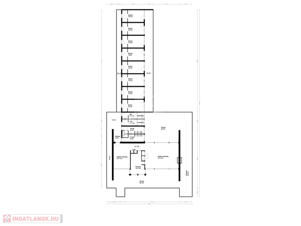Az épület kis felújítással jelenleg is alkalmas táborok vagy csoportok szezonális fogadására, a szálláshely 8 szobával üzemeltethető. A szobák előterében megtalálható a víz és vízelvezetés, nagyobb ráfordítással 8 stúdió apartman alakítható ki benne saját wc-vel ,saját fürdővel, saját minikonyhával.