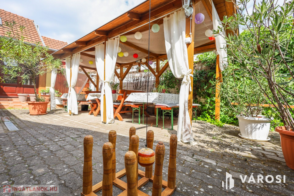 A kertben egy további tároló mellett egy tágas filagória, bográcsozó és egy szárazkapu beálló is helyet kapott.