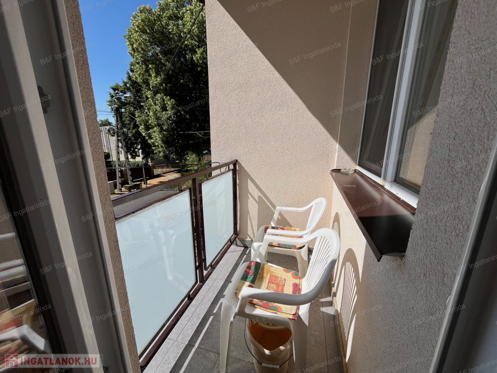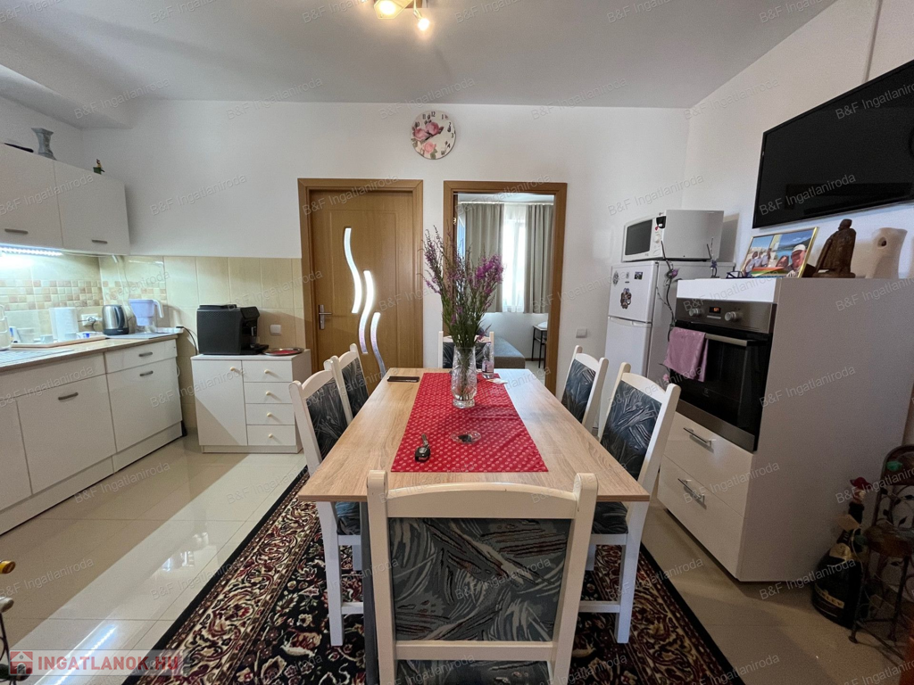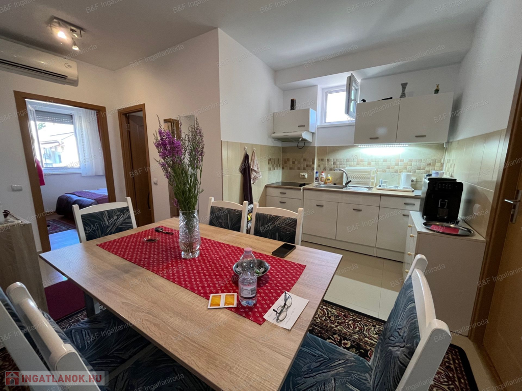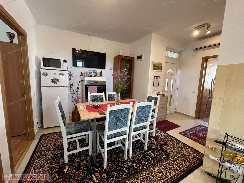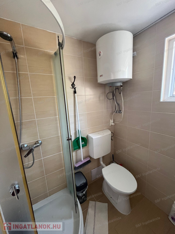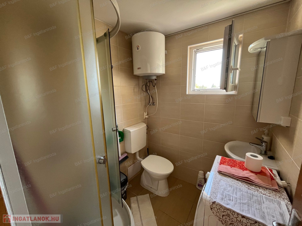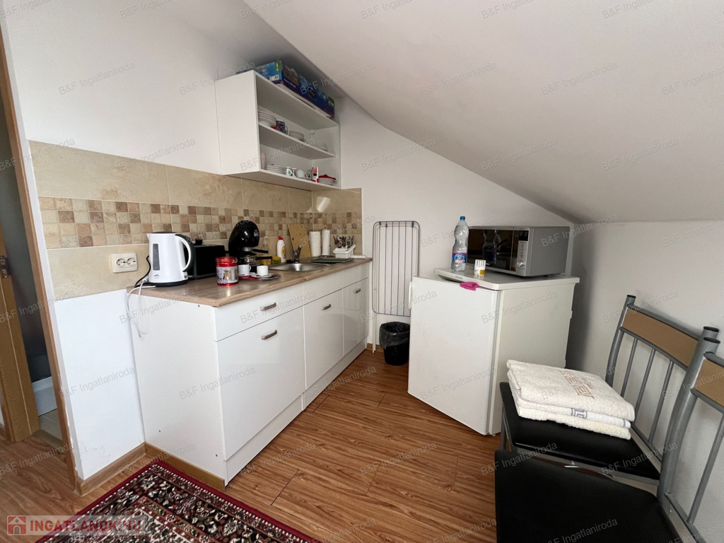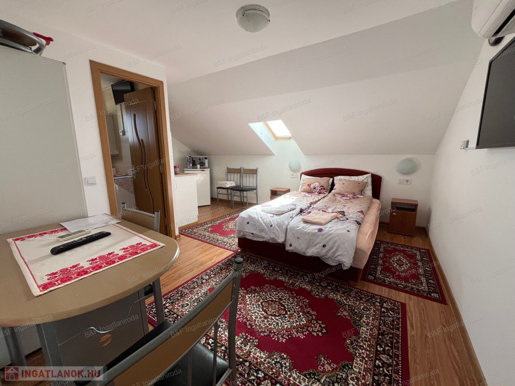 - 20,4 négyzetméterű tetőtéri apartman nappali-konyha-étkezővel, wc-s fürdőszobával rendelkezik.