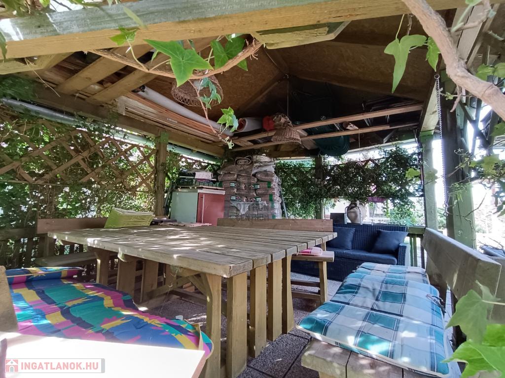 Az udvaron pergola és fedett épített kemence kapott helyet a sütögetéshez, bográcsozáshoz. Családi, baráti összejövetelek tökéletes helyszíne a zöld parkosított udvar, évelős cserjékkel, rengeteg nyíló virággal.