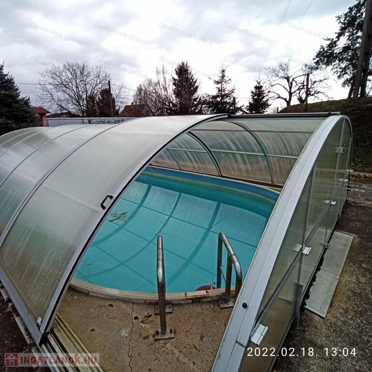Az udvaron található a 21 m3 - es medence, amely fűthető automata vízforgatóval, polikarbonát fedéllel rendelkezik.