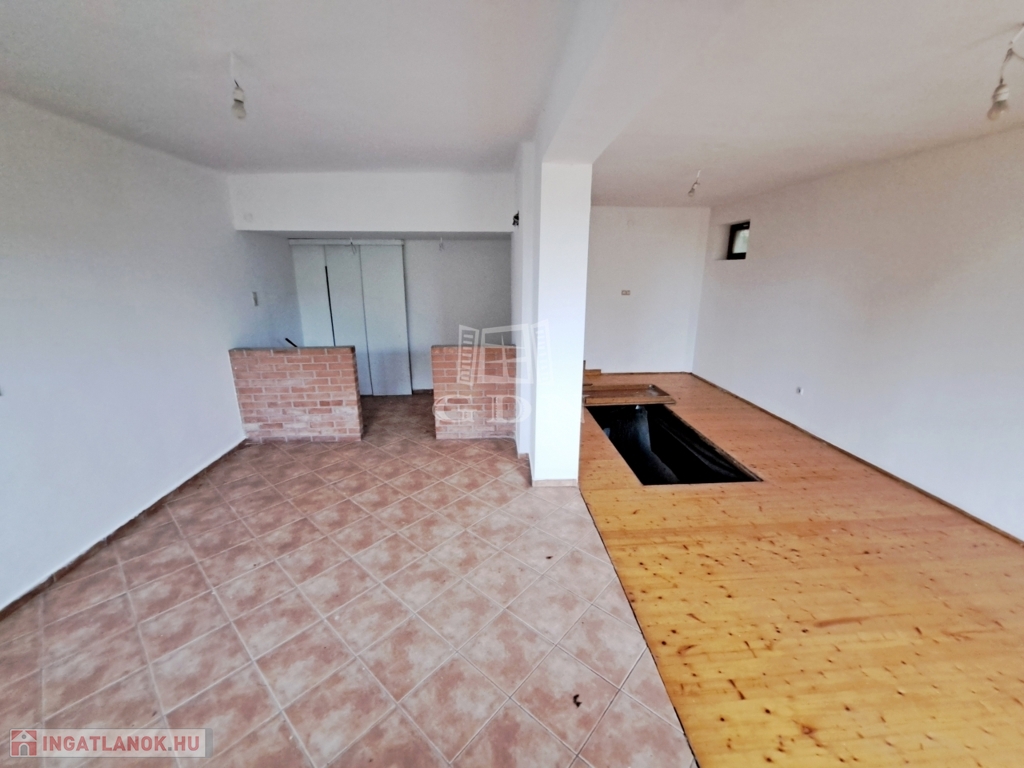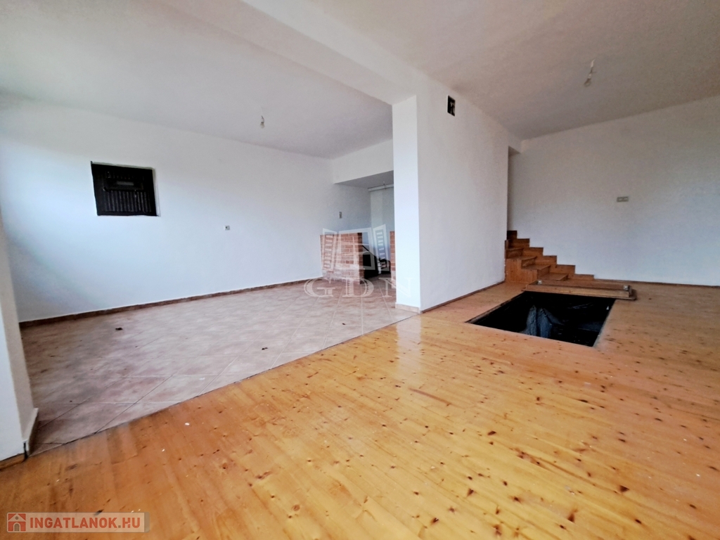-a földszinten amerikai konyha-nappali, melynek közepén lépcsős lejárat a csodálatosan kifaragott, villanyvezetékelt 112m2-es pincébe