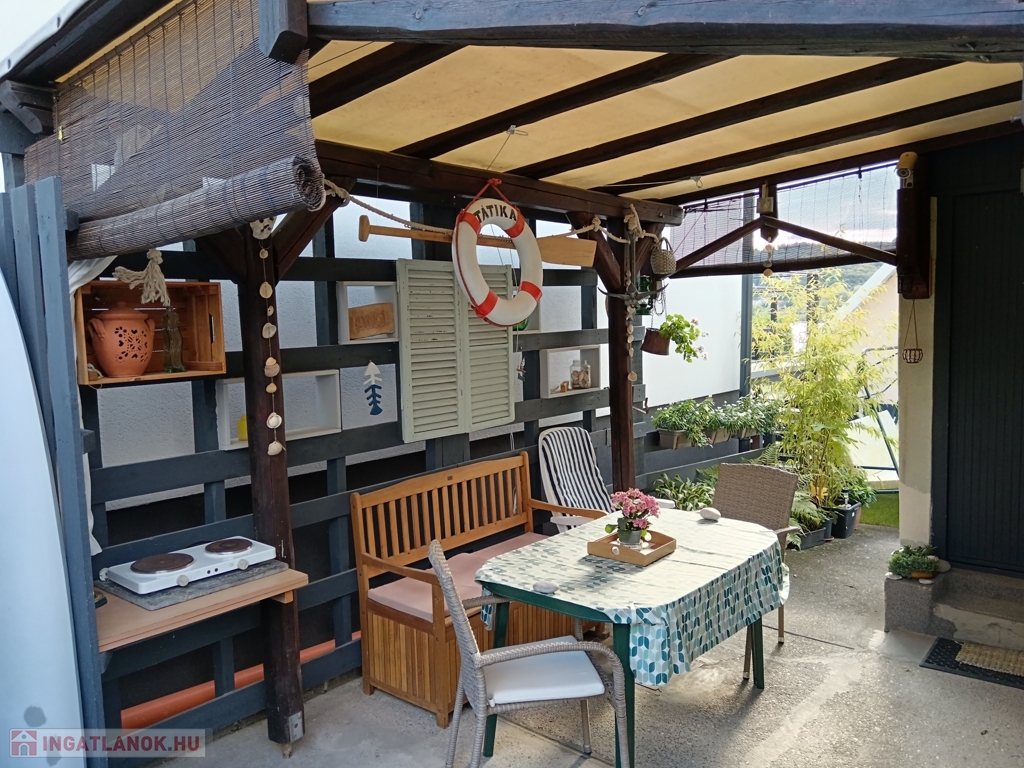 A 80 m²-es telek igényesen és praktikusan lett kialakítva. A tóra néző, tágas terasz nyugodt pihenést kínál, ezen kívül fedett terasz, tároló, hintaágy és kemence is található rajta – utóbbiak igény szerint megvásárolhatók.