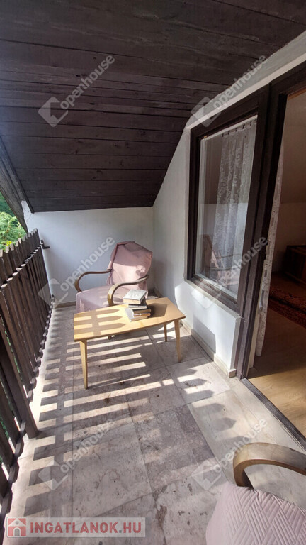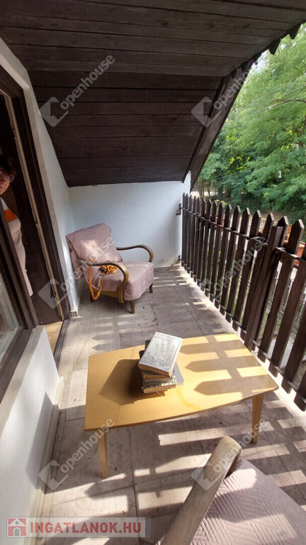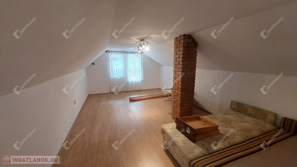 Emelet: egybenyitott, de könnyen két szobára osztható helyiség + nagy erkély.
