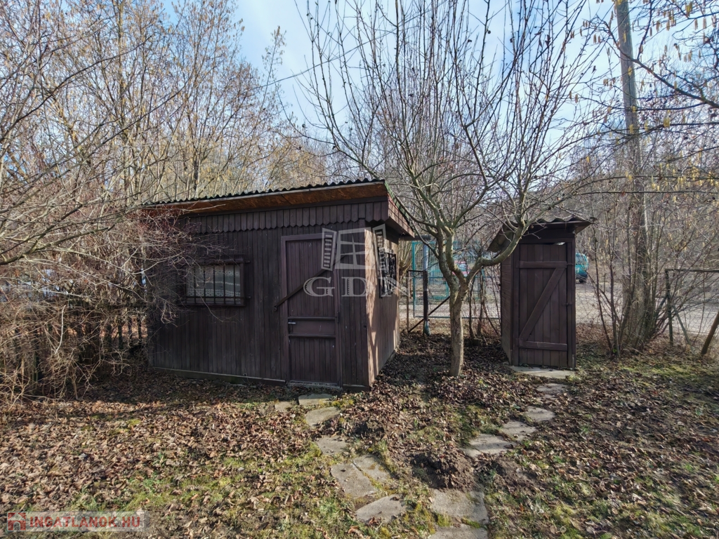 A telek végében, fa szerkezetű szerszámtároló és kültéri WC húzódik.