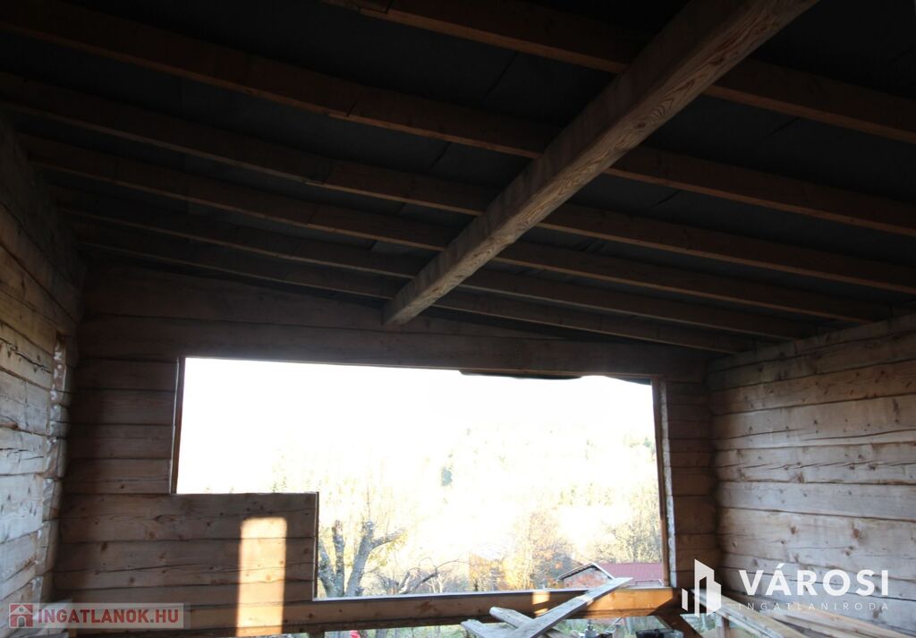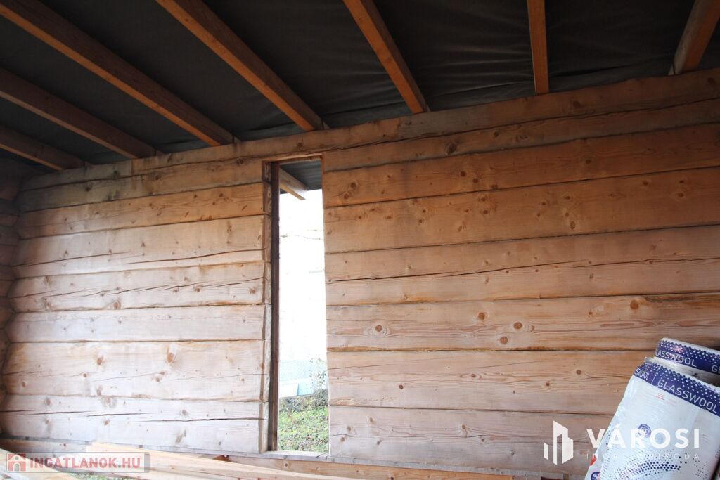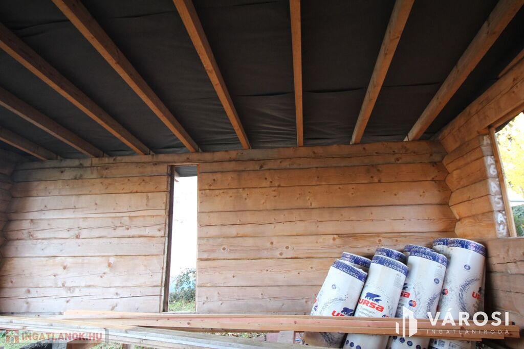 A rönkház szerkezete már készen van, a tetővel együtt. A nyílászárókat, az alsó padozatot, és a mennyezeti szigetelést kell még beépíteni.