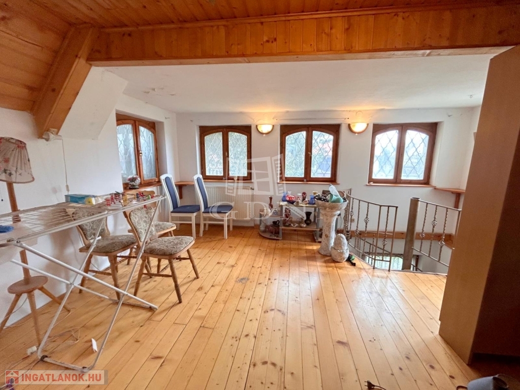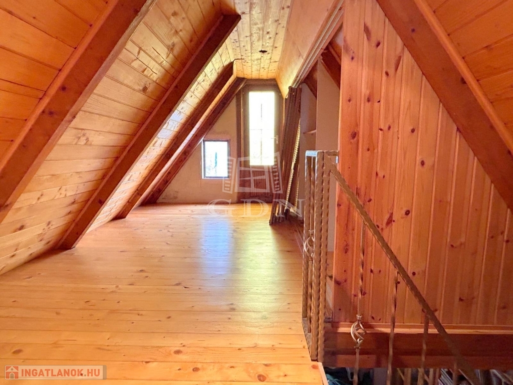4748. Sukorón, 1997-ben bővített és hőszigetelt, 80-as években épült, háromszintes, egész évben lakható, gázközponti fűtéses, iker jellegű faház nyaraló eladó. Az alsó szuterén szinten található az étkező és a konyha kemencével. A faház földszinti lakóteréhez kapcsolódik 13,6 m2-es és 22,8 m2-es fedett, fűtött lakótér. A tetőtérben két félszoba és erkély található. A nyaralóhoz 532 m2-es, összközműves telekrész tartozik. Parkolás telken belül, nagy méretű fedett kocsibeállón lehetséges. Ár: 55 Mft