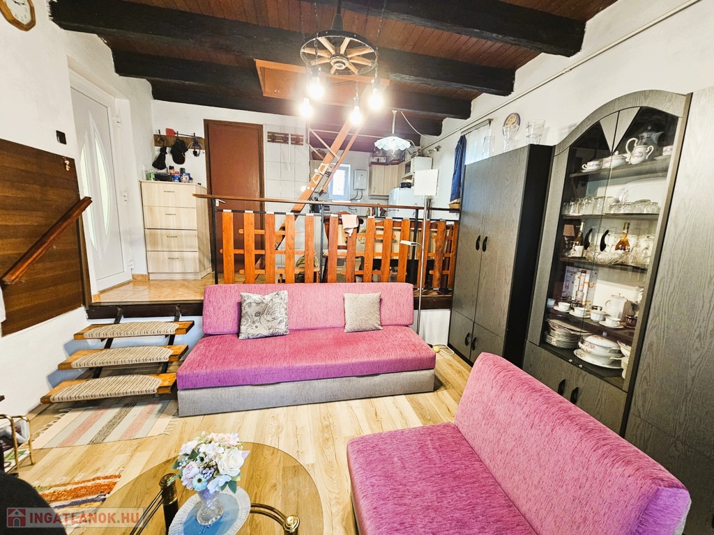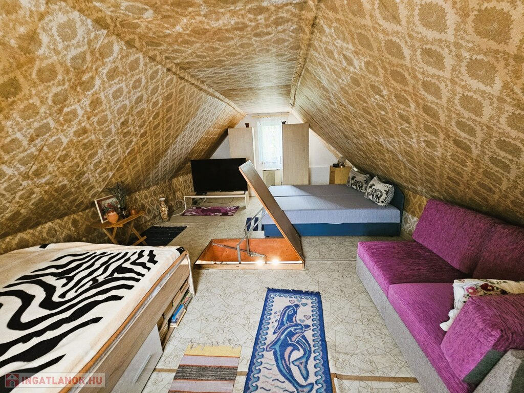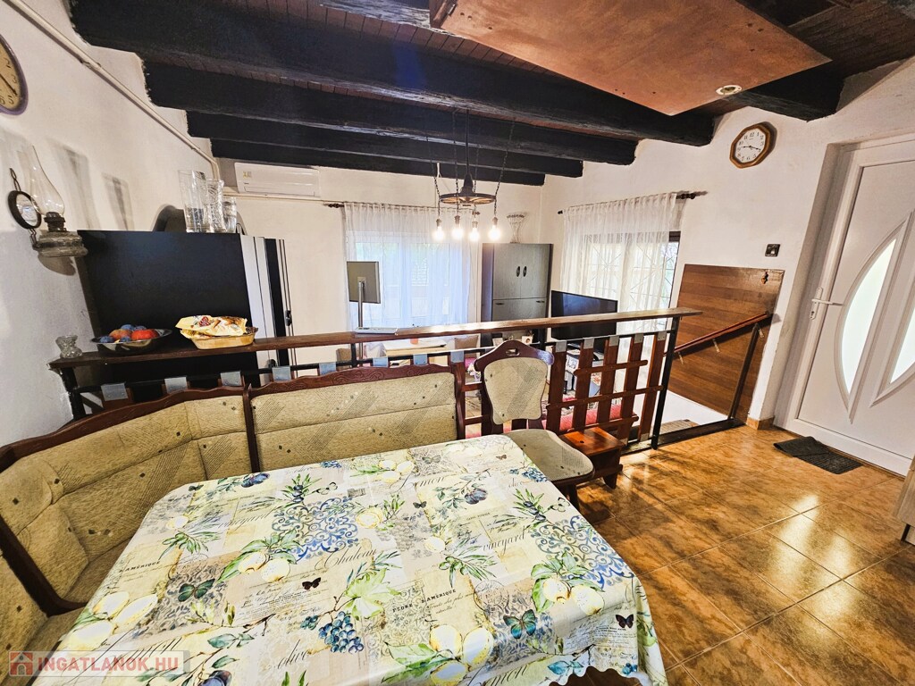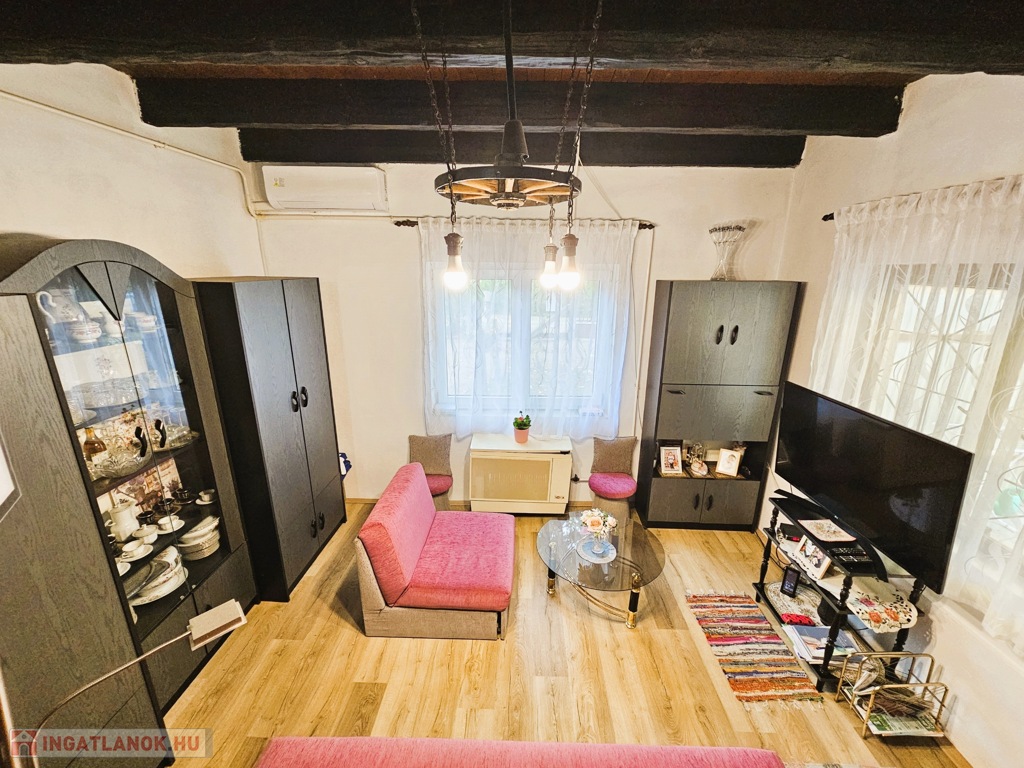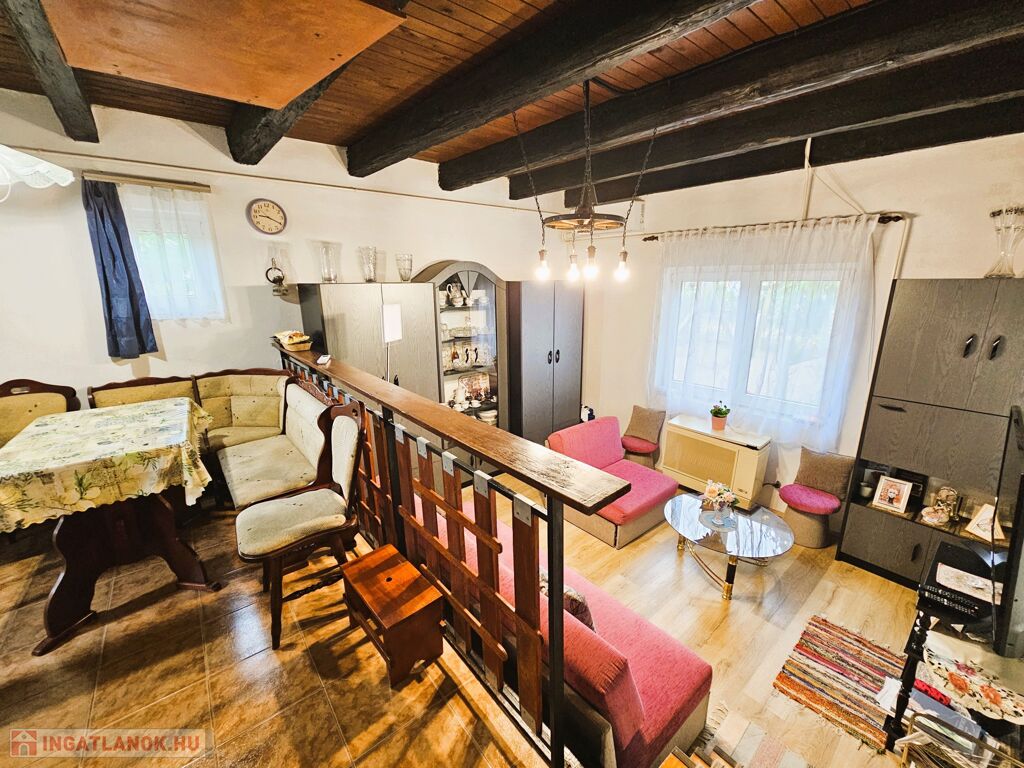 A lakóház 55 m2-es jó elosztású: 2 szoba, közlekedő, konyha, fürdő, 13 m²-es pince és fedett terasz. 2023-ban korszerű műanyag nyílászárókat építettek be, a fűtésről gázkonvektorok és mindkét szinten inverteres klíma gondoskodik, melegvizet villanybojler állítja elő. Az autó parkolás egy 20 m²-es, mobil lemezgarázs szolgál.