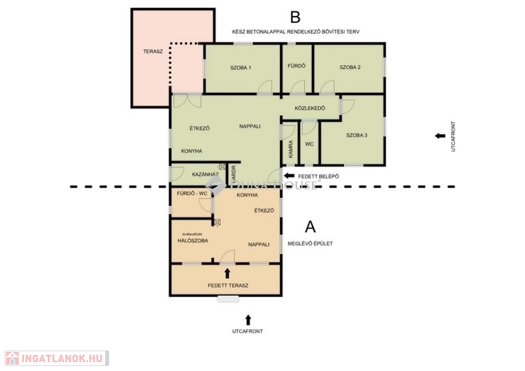 Bővítés: a meglévő épület továbbépítésével 130–140 m²-es családi ház alakítható ki.