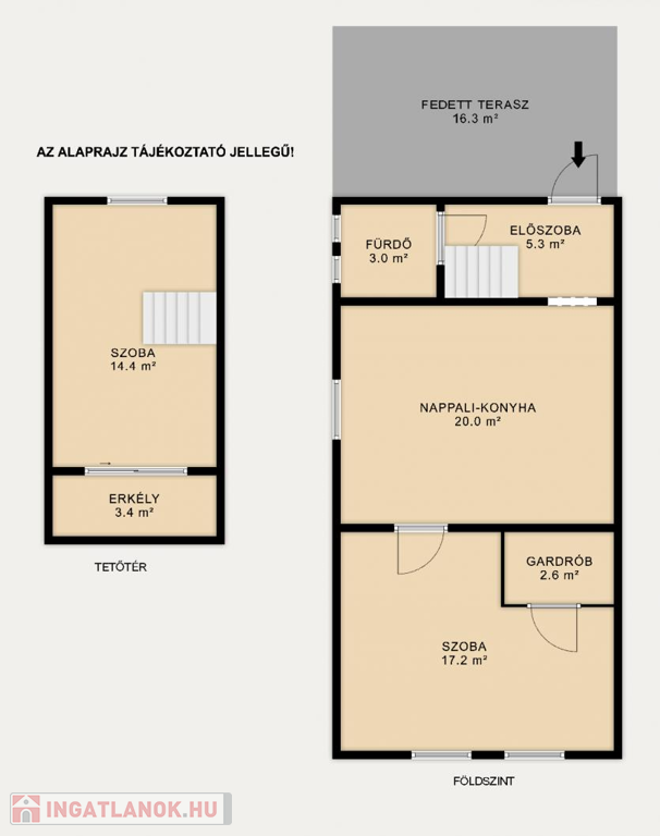 • TETŐTÉR: Világos, jól szellőző lakótér beépített szekrényekkel, amely tökéletes lehet hálószobának, dolgozónak vagy vendégtérnek