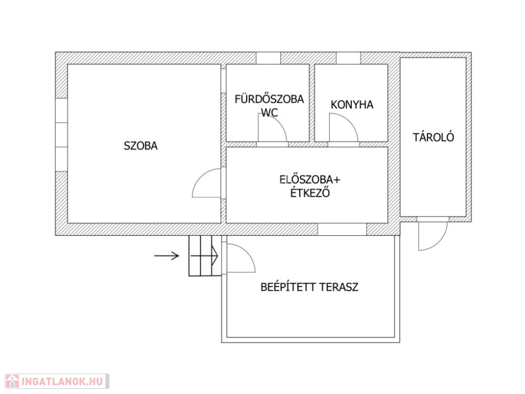 A ház helyiségei egy szoba, konyha, fürdőszoba, előszoba és beépített terasz.