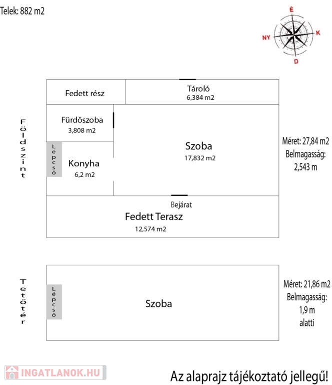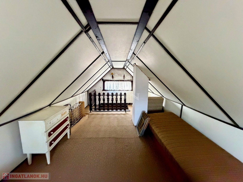 A tetőtér mérete 22 m2, de az 1,9 m belmagasság alatti.