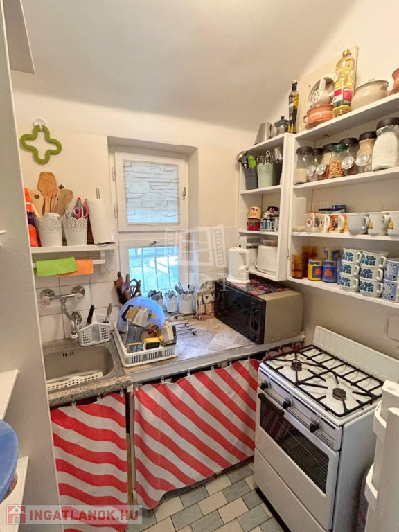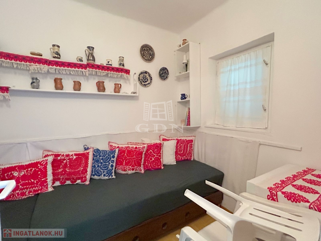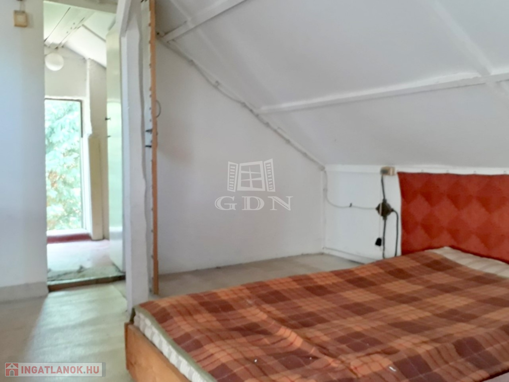 4846. Velencefürdőn a számozott utcák felső szakaszában fekvő, 541 m2-es, 20%-ban beépíthető telken, 60-as években épült, karbantartott, jó állapotú, nappali + 2 félszobás + a tetőtérben kialakított 1 hálószobás, 33 m2 nettó alapterületű, tégla építésű, zsindely fedésű, hordozható cserépkályhával fűthető hétvégi ház, 9 m2-es terasszal, tároló helyiséggel eladó. A gondozott, szép kertben termő gyümölcsfák, örökzöld növényezet, betonozott kerti pince és faház tároló találhatók. Parkolás telken belül is lehetséges. Bővítéssel a nyaraló lakóházzá is átépíthető. Irányár: 38,5 Mft
