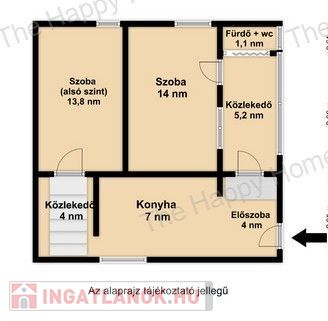 a bejárati ajtón belépve az előtérből balra nyílik a gépesített konyha, innen egy lépcsőn jutunk le az egyik lakószobába. Az előtérből jobbra elindulva egy közlekedő helyiségbe érkezünk, innen nyílik a fürdőszoba, illetve még egy lakószoba. Az épület valamennyi helyisége BELSŐ LÉPCSŐN megközelíthető!