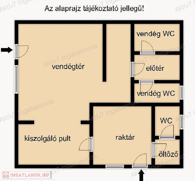 Közel 100 m2 alapterületen , egy vendégtér, kiszolgáló pult, szociális helyiségek, raktár található.