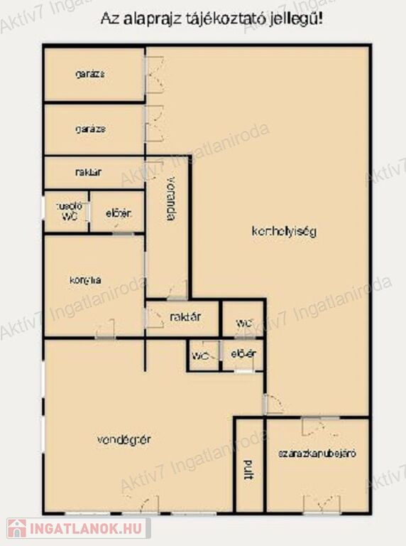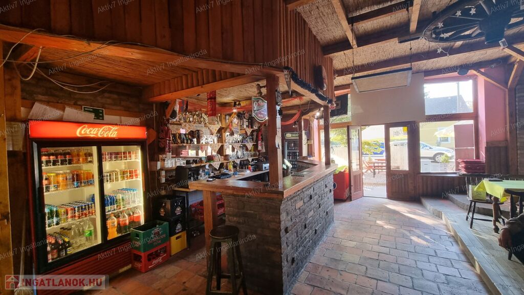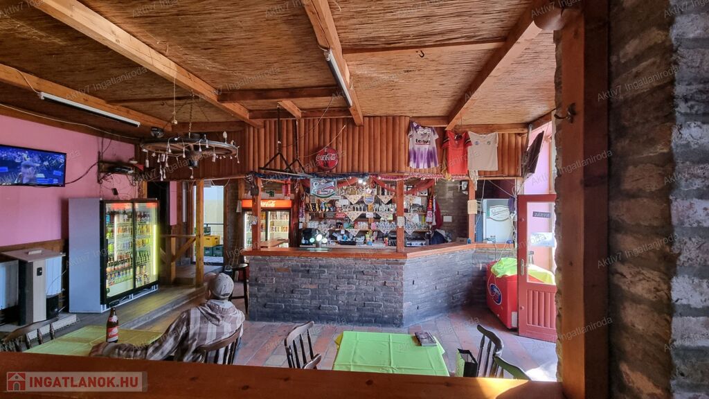 Az épület kb. 250 m2 területű, téglaépítésű. Az elrendezés tekintetében: kiszolgáló pult, vendégtér, konyha, raktárak és szociális helyiségek vannak kialakítva, valamint két udvari garázs ami raktárként funkcionál. Jelenleg konyhát nem üzemeltetnek, de van főzési és pizza sütési lehetőség is.
