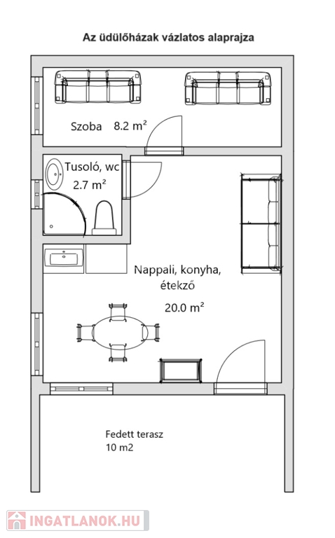 Az üdülő épületek faházai, egyenként 30 nm nagyságúak (nappali-konyha, fürdőszoba és 1 szoba helyiségből állnak, a házak egyenként 4+1 fő elhelyezésére alkalmasak), gáz fűtési lehetőséggel rendelkeznek. A faházakat teljeskörűen felújították.